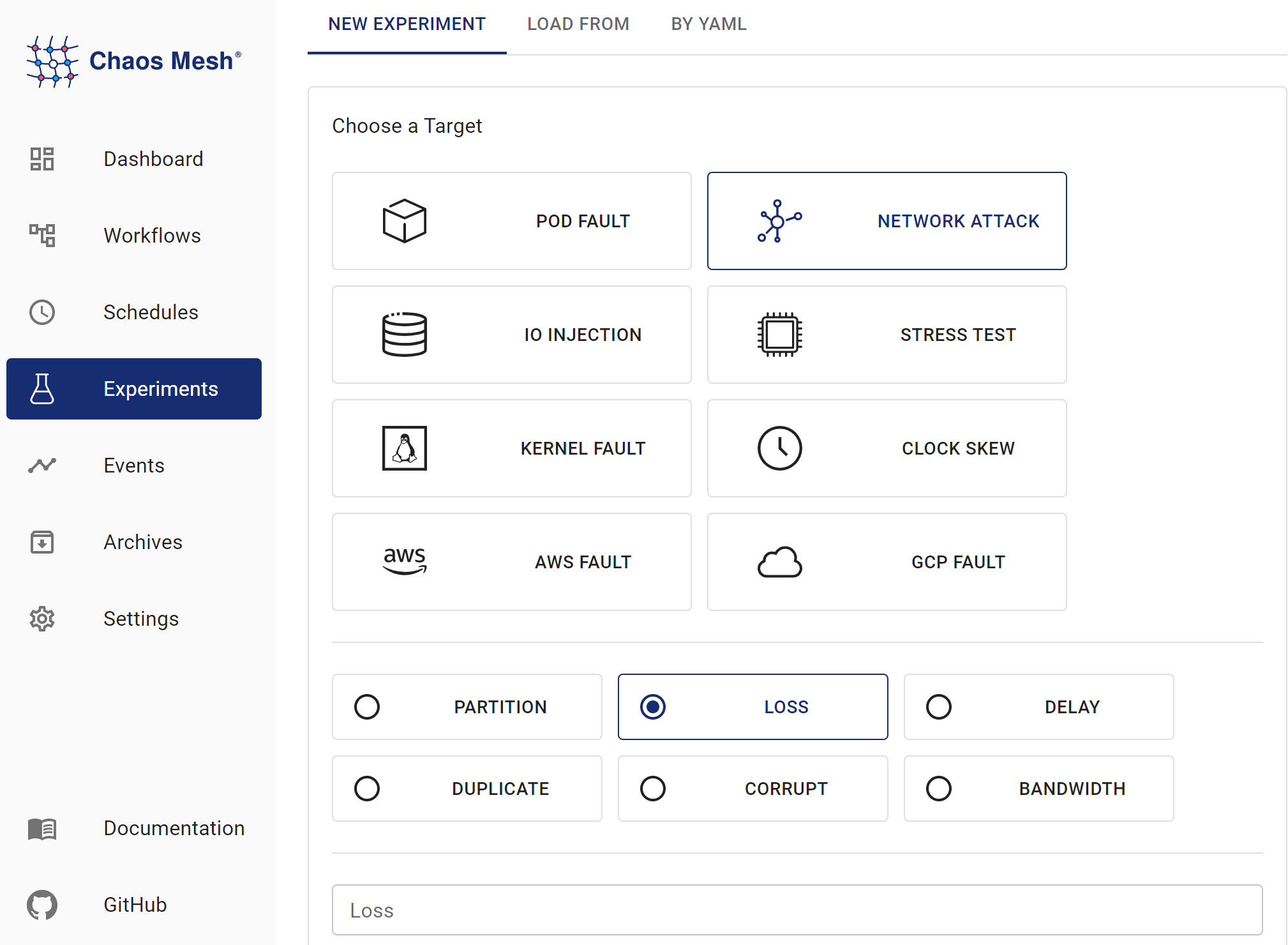 2. In the Choose a Target area, choose NETWORK ATTACK and select a specific behavior, such as LOSS. Then fill out specific configuration.