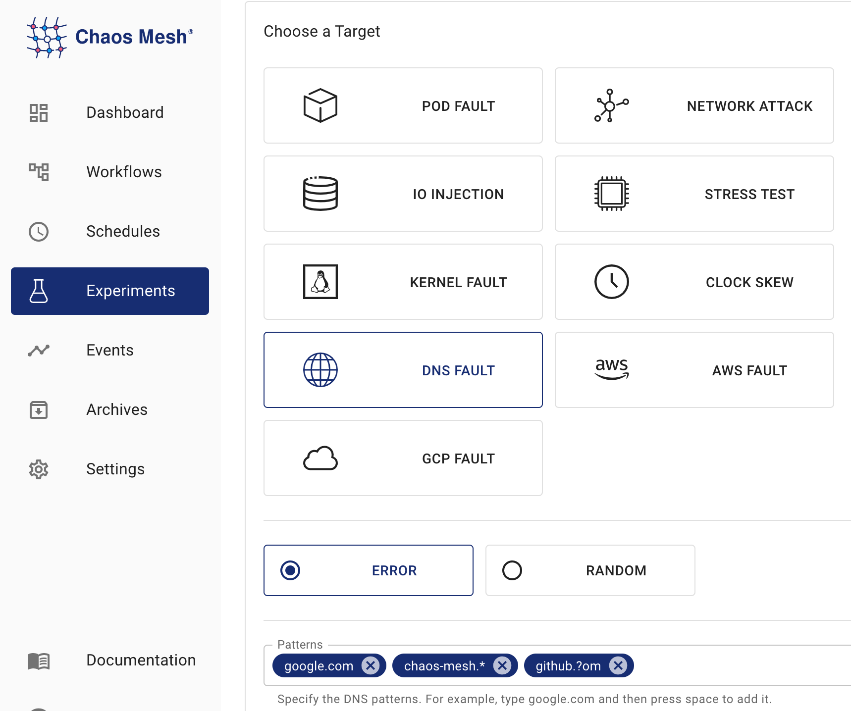 patterns | String array | Selects a domain template that matches faults. Placeholder ? and wildcard are supported. * | [] | No | google.com, chaos-mesh.org, github.com |