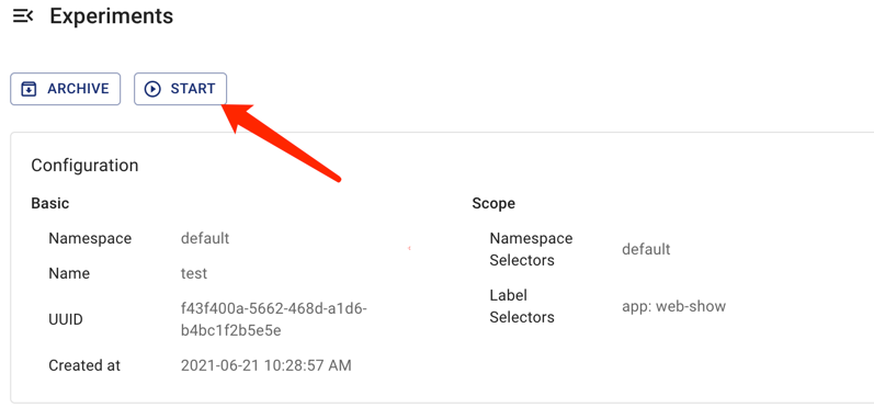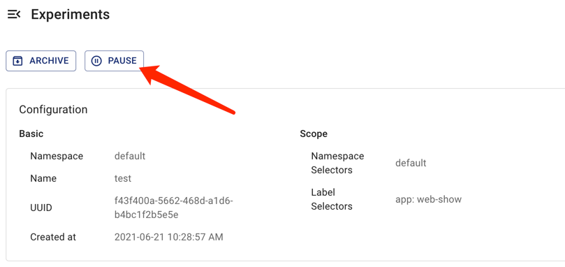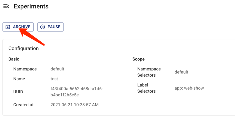 If you want to delete a Chaos experiment on Chaos Dashboard and archive it to the experiment history, you can click the corresponding Archive button of the Chaos experiment.