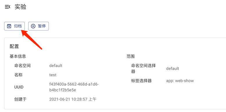 如果你想要在 Dashboard 上删除混沌实验并归档到历史记录汇总,可以点击对应混沌实验的归档按钮。