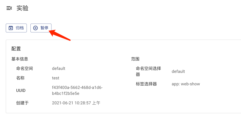 如果你想通过 Dashboard 暂停或者恢复混沌实验,找到对应的混沌实验点击暂停或者启动按钮即可。