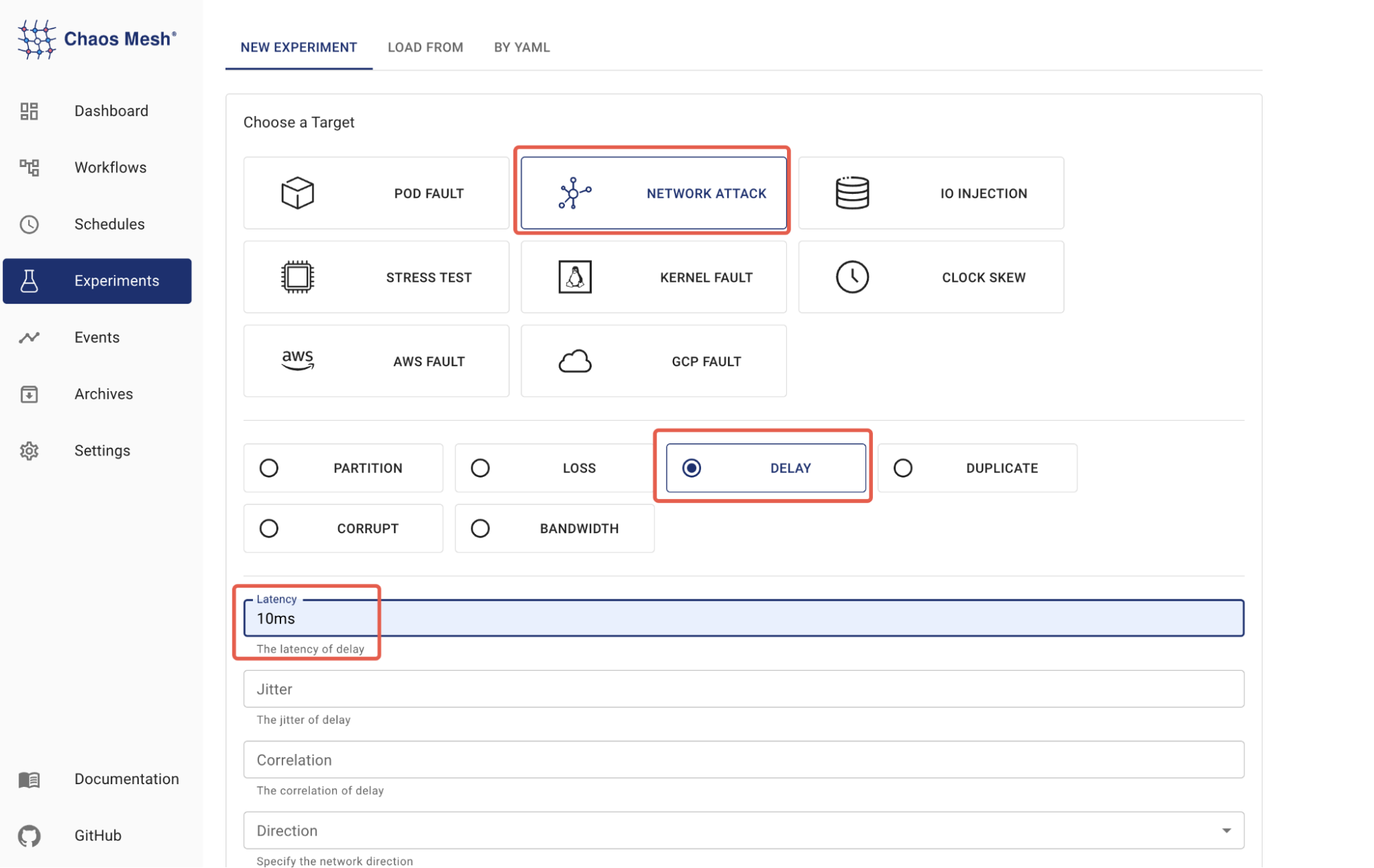 Log in to Chaos Dashboard to create a chaos experiment. To observe the effect of network latency on the application, we set the **Target **as "Network Attack" to simulate a network delay scenario.