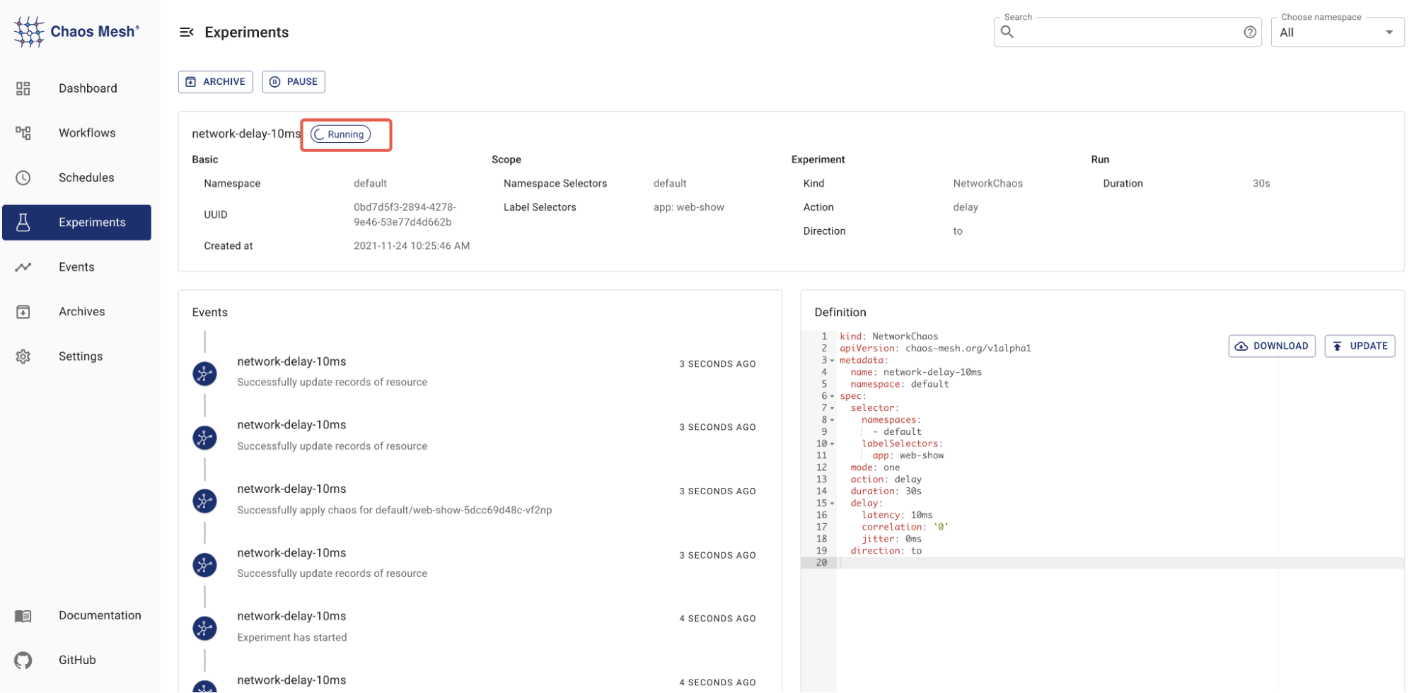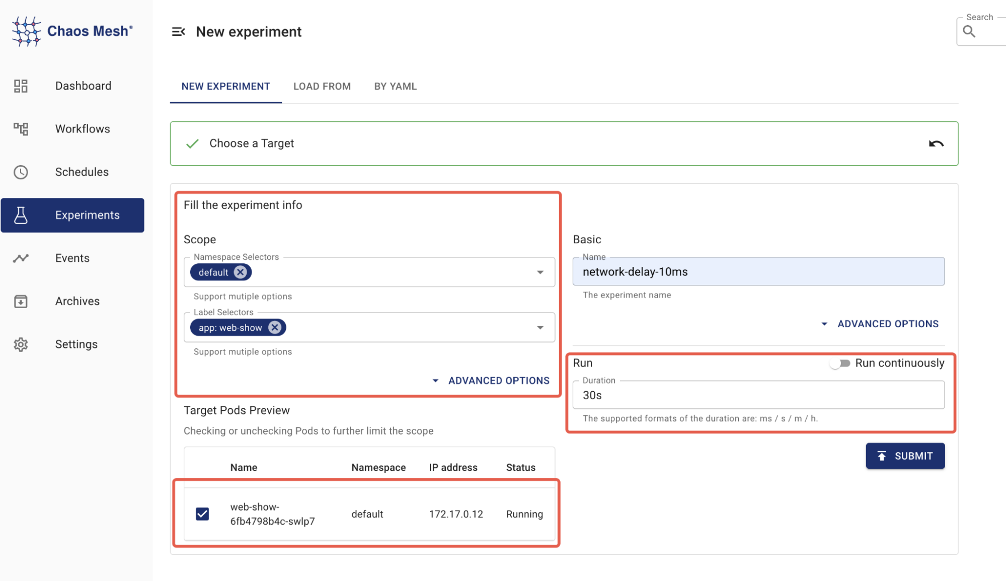 Before creating a chaos experiment, you should identify and deploy your experiment target, for example, to test how an application works under network latency. Here, we use a demo application web-show as the target application to be tested, and the test goal is to observe the system network latency. You can deploy a demo application web-show with the following command: web-show.
