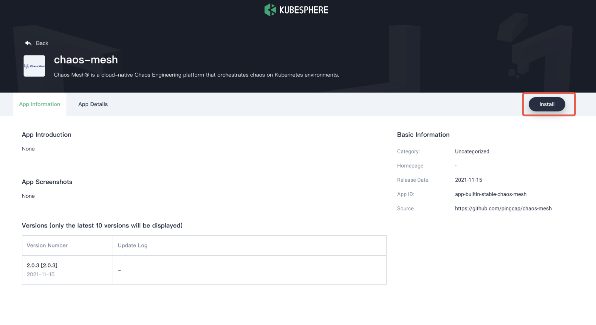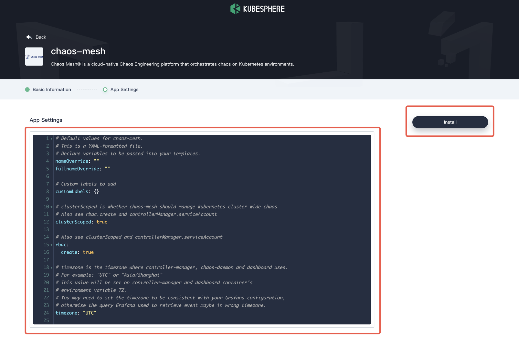 KubeSphere makes cloud-native application deployments and maintenance easy. Thanks to the App Store, users can easily deploy Chaos Mesh on KubeSphere with just a few clicks, enabling you to quickly start your own chaos experiments.